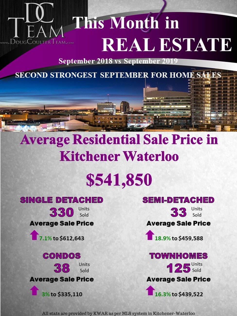 Enter Blog PKITCHENER-WATERLOO, ON (October 3, 2019) ––526 residential properties sold through the Multiple Listing System (MLS® System) of the Kitchener-Waterloo Association of REALTORS® (KWAR) in September, an increase of 17.7 per cent compared to the same month last year. Call us for more information or to find out how much your home is worth, 519-772-4378